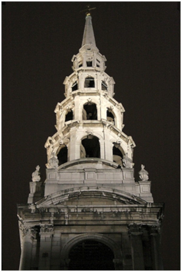 Steve asked us if the steeple reminded us of anything. Neither energy nor powers of imagination were not at their peak so we stood shaking our heads and he told us the story: an apprentice baker fell in love with his master’s daughter and wanted to make a special cake for his wedding that was to take place at St Bride’s church. He came up with the brilliant idea of copying the tiers of St Bride’s and people have been doing the same ever since. Do couples in your country usually have tiered wedding cakes? Well, we were particularly lucky because that day the priest was there and just about to lock up or the night but he stayed and answered our questions and told us about the war damage so all the inside is new, but Wren’s steeple survived along with the skeletons in the crypt.